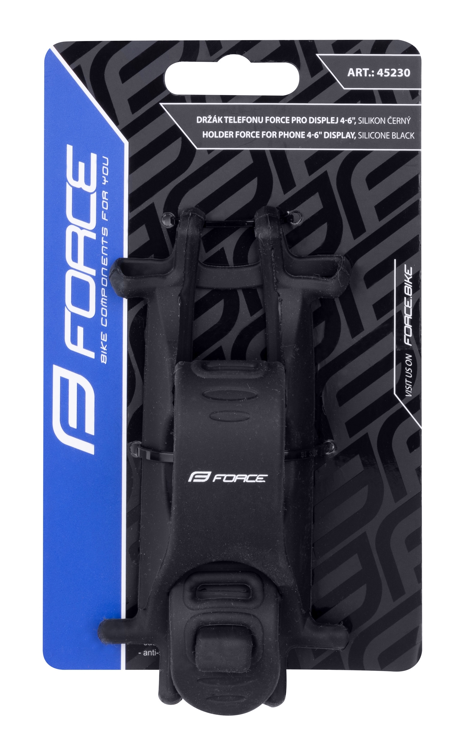 univerzální držák mobilního telefonu na řidítka pro telefony s úhlopříčkou displeje 4" - 6" pevný úchyt, protiskluzný design, jednoduchá a rychlá instalace nastavitelný úchyt pro všechny průměry řidítek lze uchytit na představec při horizontálním nastavení displeje odolný silikon, nepoškozuje povrch telefonu ani řidítek velikost: 13 x 6,5 x 4,5cm, hmotnost: 55g materiál: ekologický silikon, omyvatelný, baleno na kartě FORCE (držák nedoporučujeme používat za silného deště)